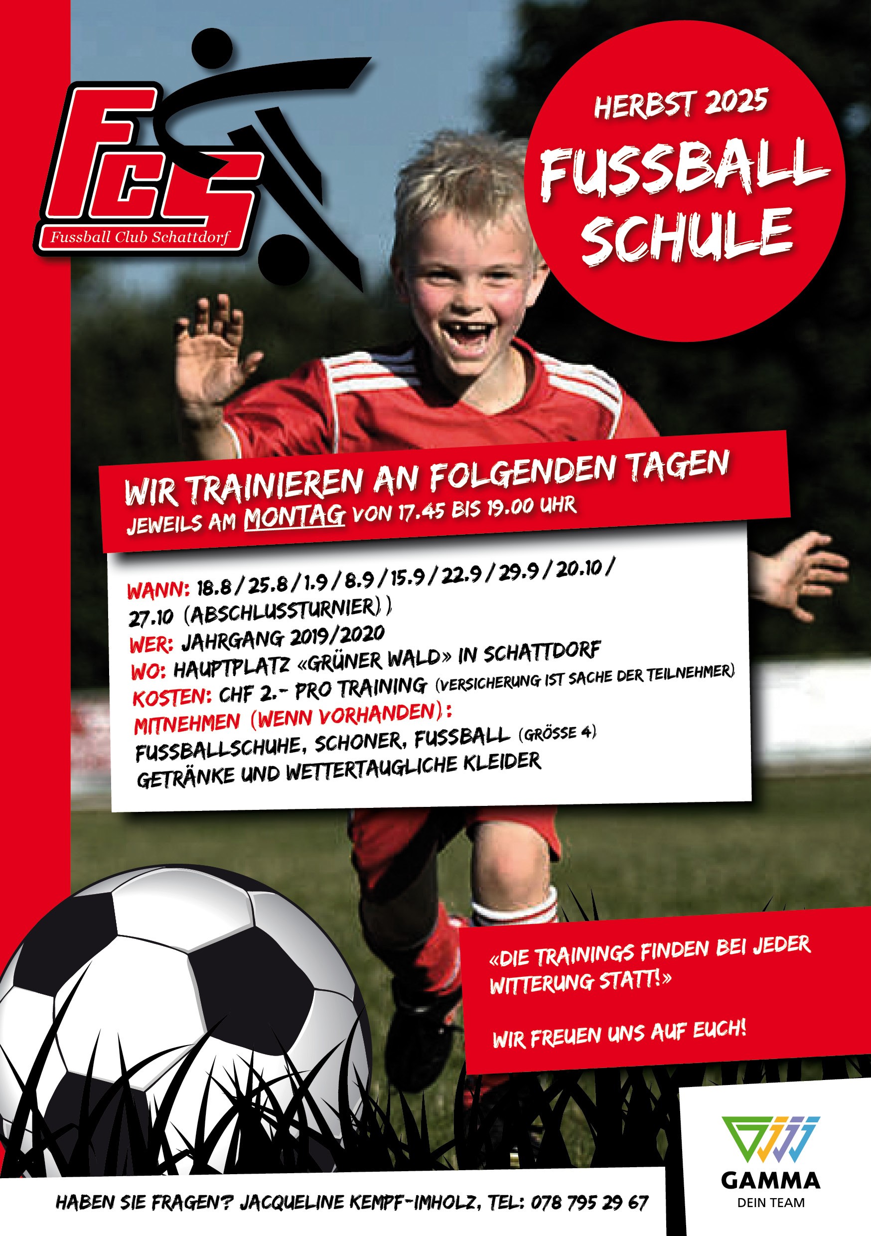 Ab dem 18. August 2025 findet jeweils montags von 17.45 bis 19.00 Uhr die Fussballschule für Kinder mit Jahrgang 2019 und 2020 auf dem Sportplatz Grüner Wald statt. Weitere Informationen hierzu sind im Flyer (siehe untenstehend) zu finden.