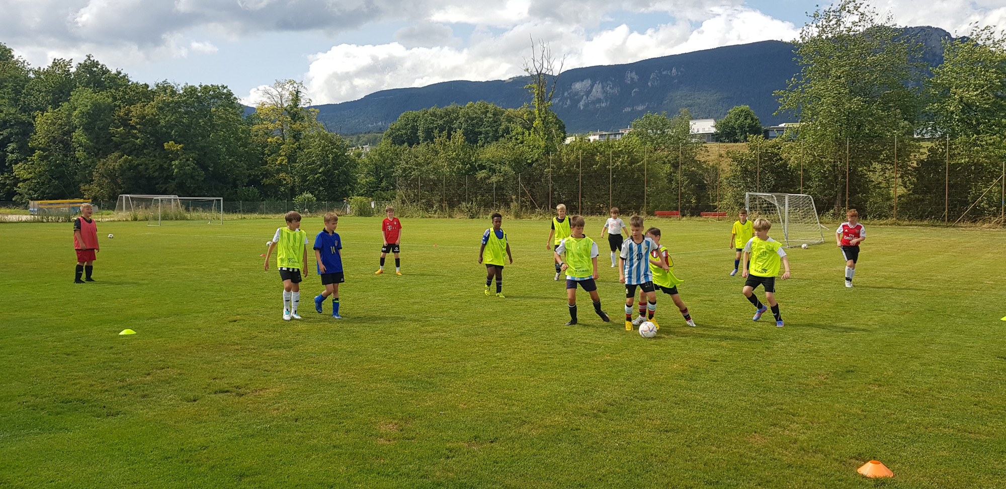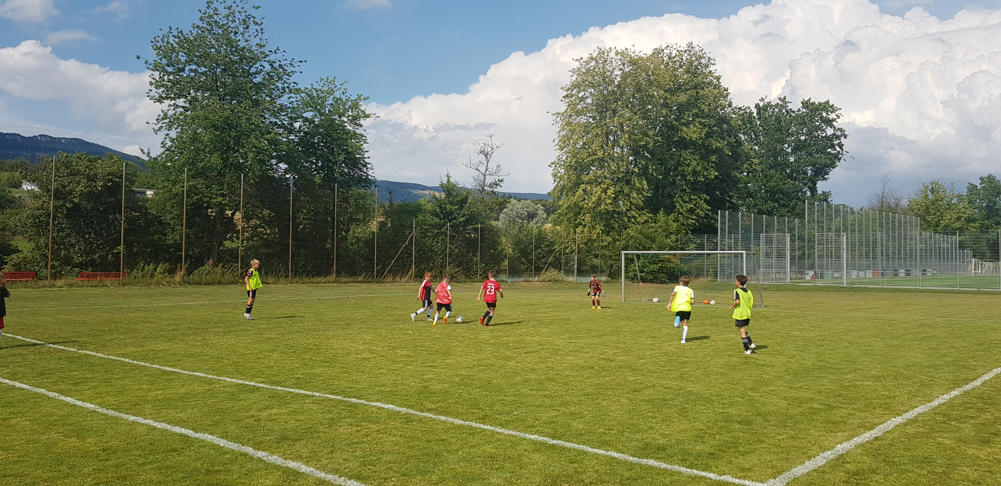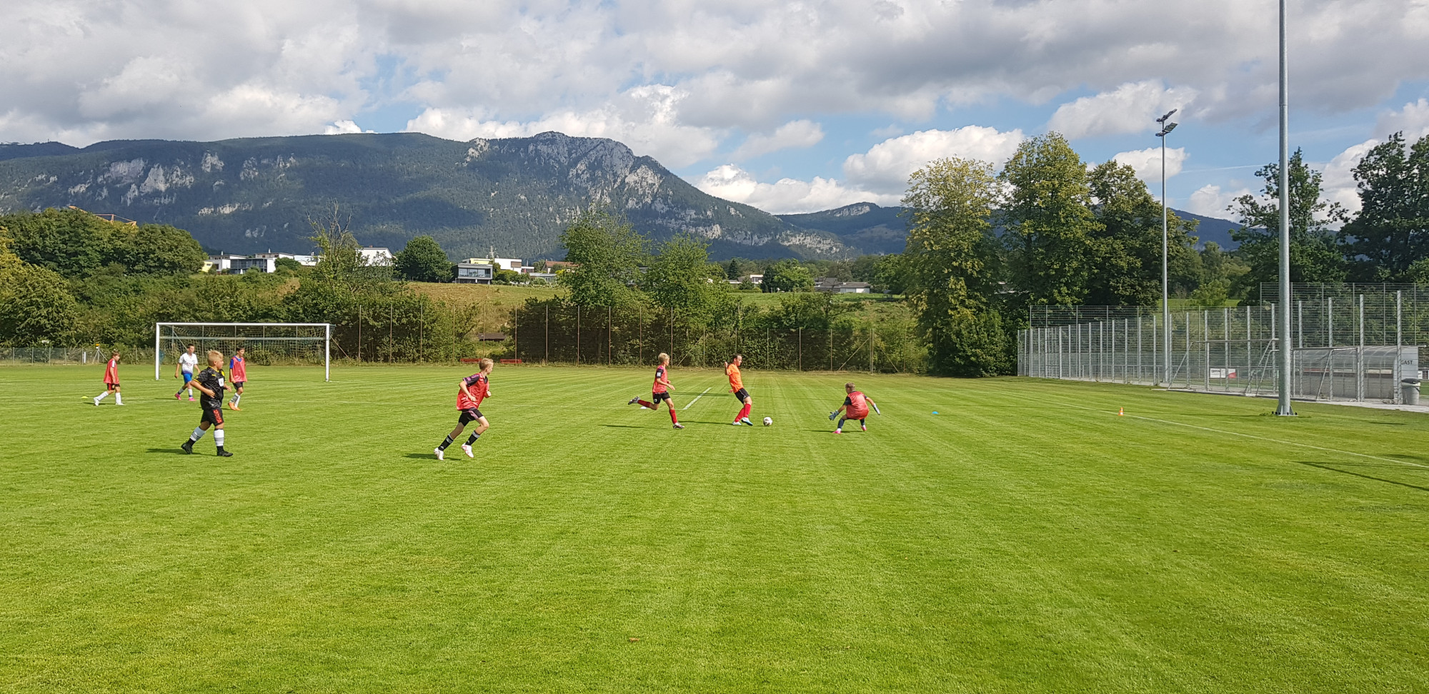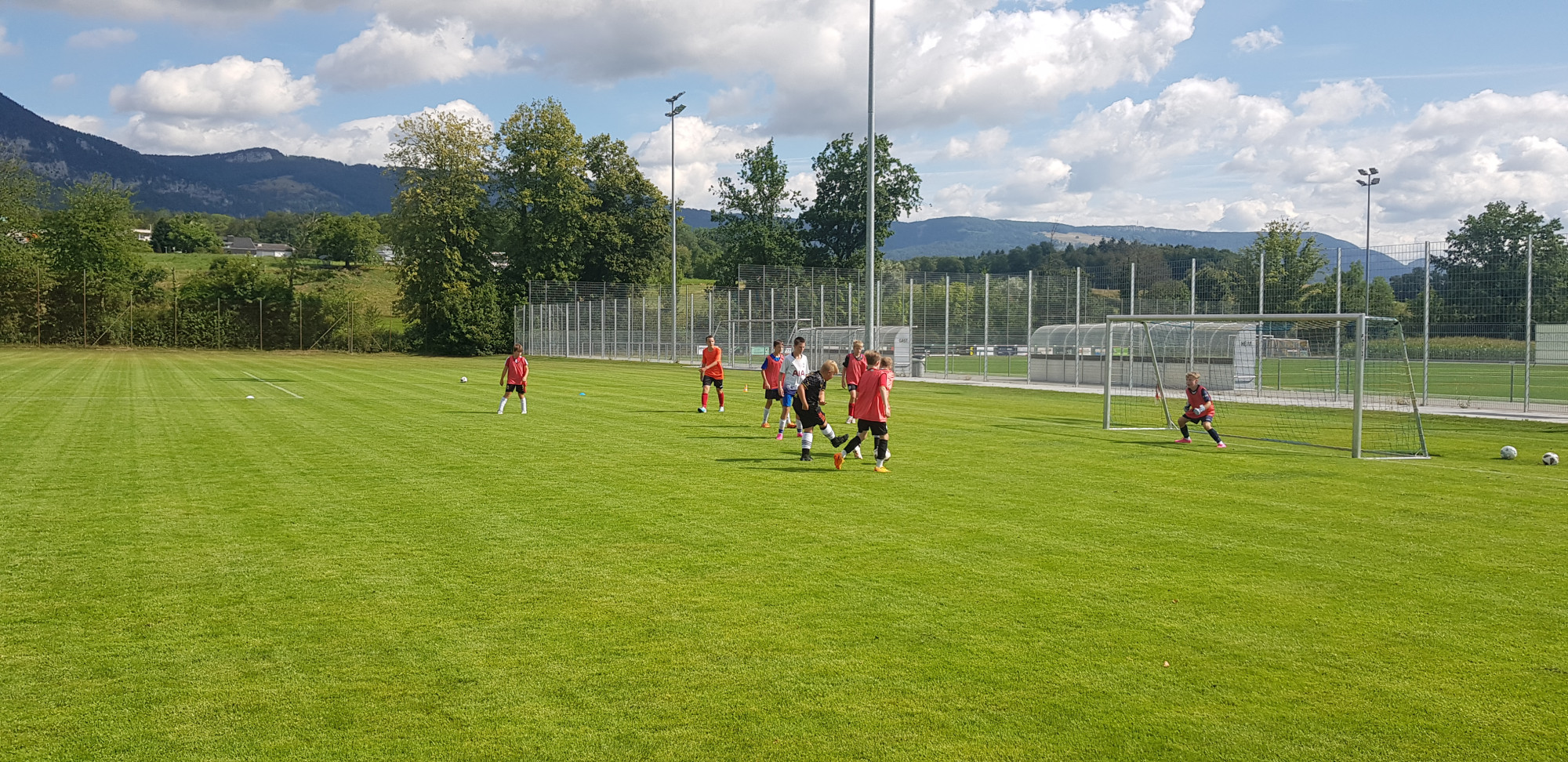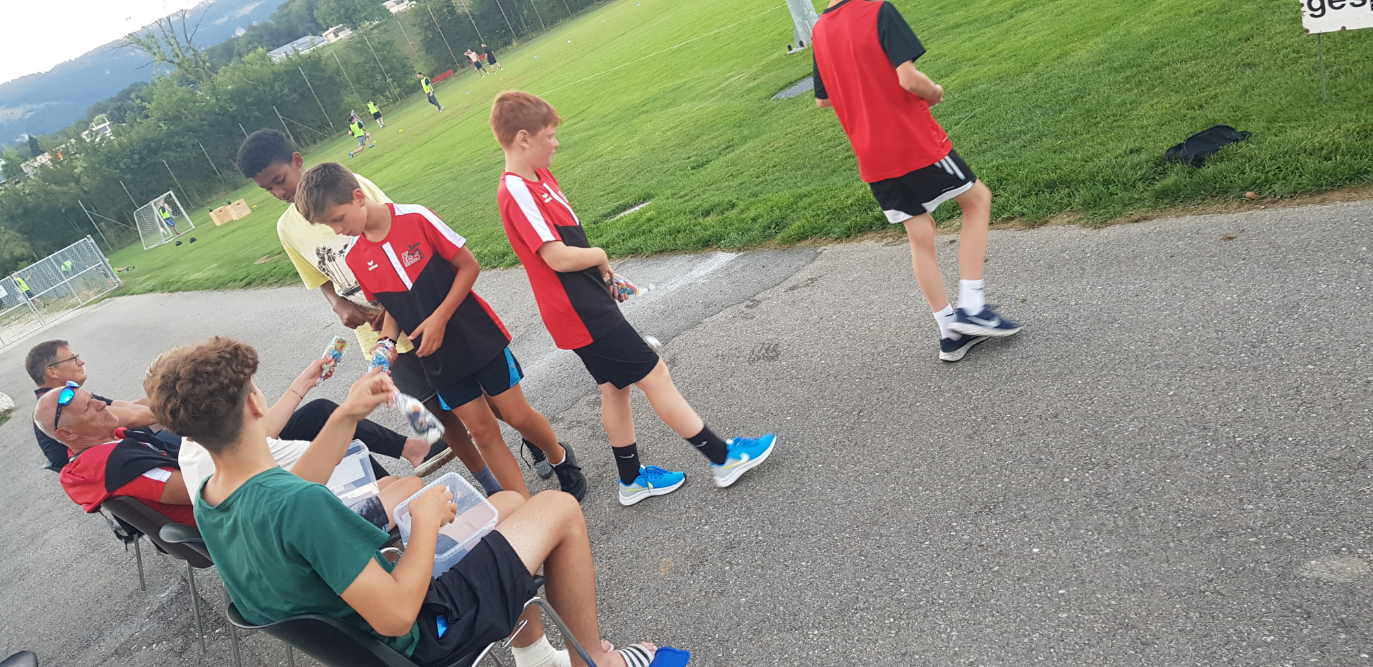 Für die Woche waren insgesamt 7 Trainings und ein Turnier (Freitag) geplant. Bei perfekten (Trainings-) Temperaturen wurde vormittags in drei Gruppen trainiert, wobei eine Gruppe durch die Torhüter gebildet wurde. Nachmittags waren dann zwei (grössere) Trainingsgruppen im Einsatz. Auf dem Platz wurde vor allem an der Technik gefeilt, viele Spielformen absolviert und die eine oder andere Spassübung durfte auch nicht fehlen. Vom Jüngsten (Jahrgang 2013) bis zum Ältesten (Jahrgang 2007) sah man der ganzen Truppe an, dass sie mit Spass, Motivation und Einsatz dabei waren. Bei der älteren Trainingsgruppe durfte natürlich auch das «Mentalitätstraining» beim Schleifer H. S. vom Schattdorfer Hausberg nicht fehlen. Leider konnten zwei Teilnehmer das Lager nicht wie gewünscht beenden. Ein Bienenstich am Fuss wie auch eine starke Knochenprellung liessen weitere Trainings nicht zu.
