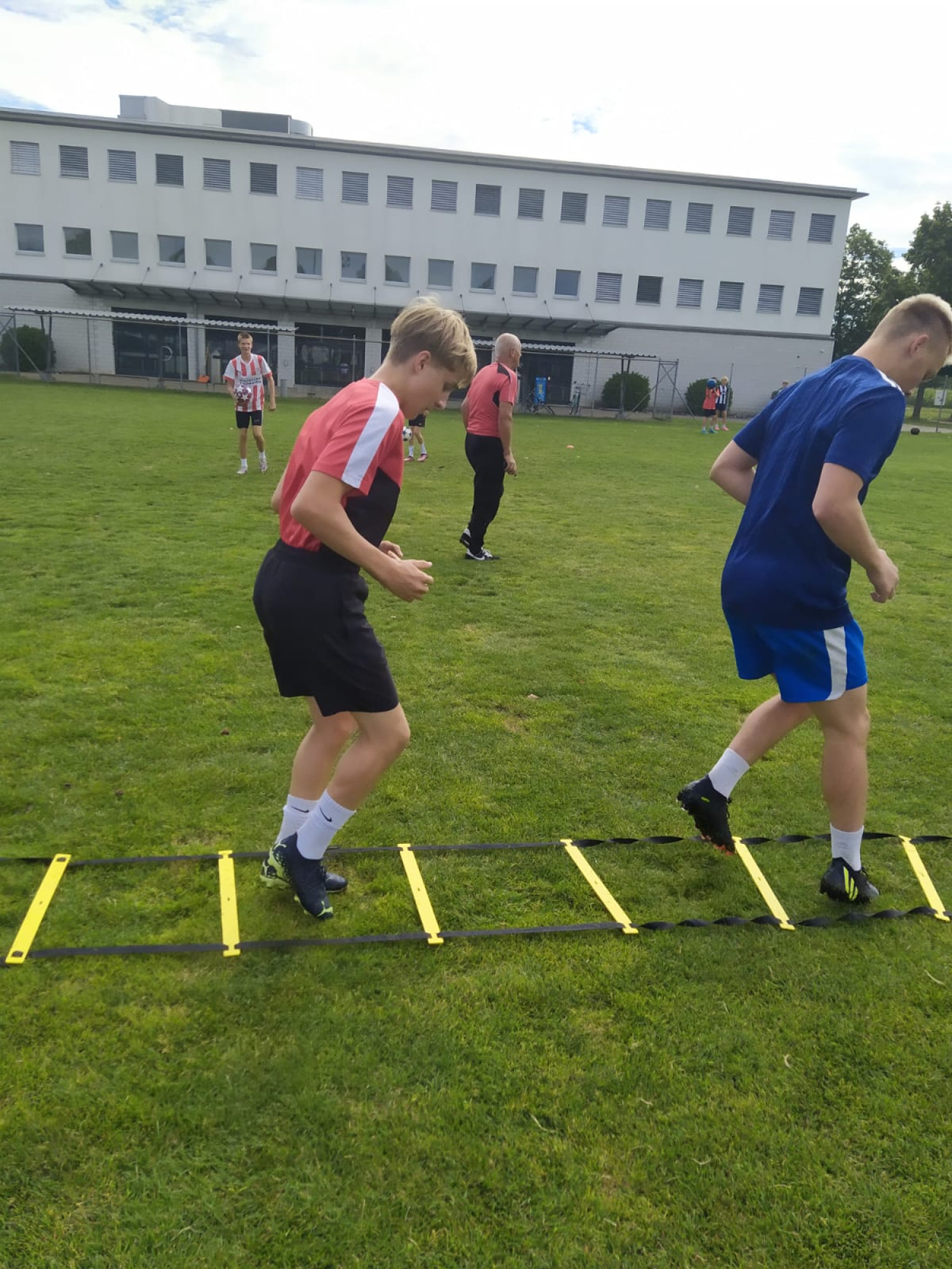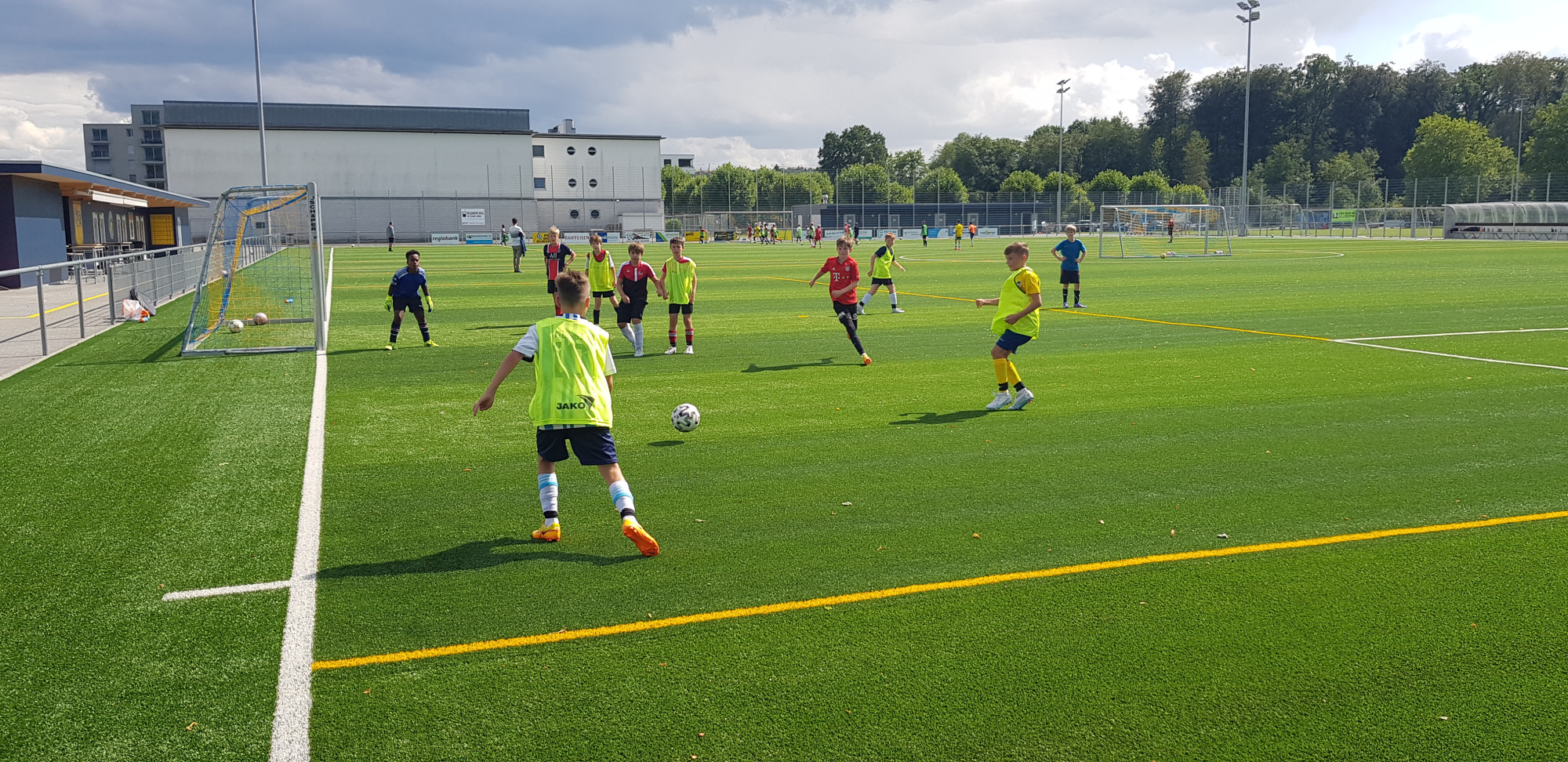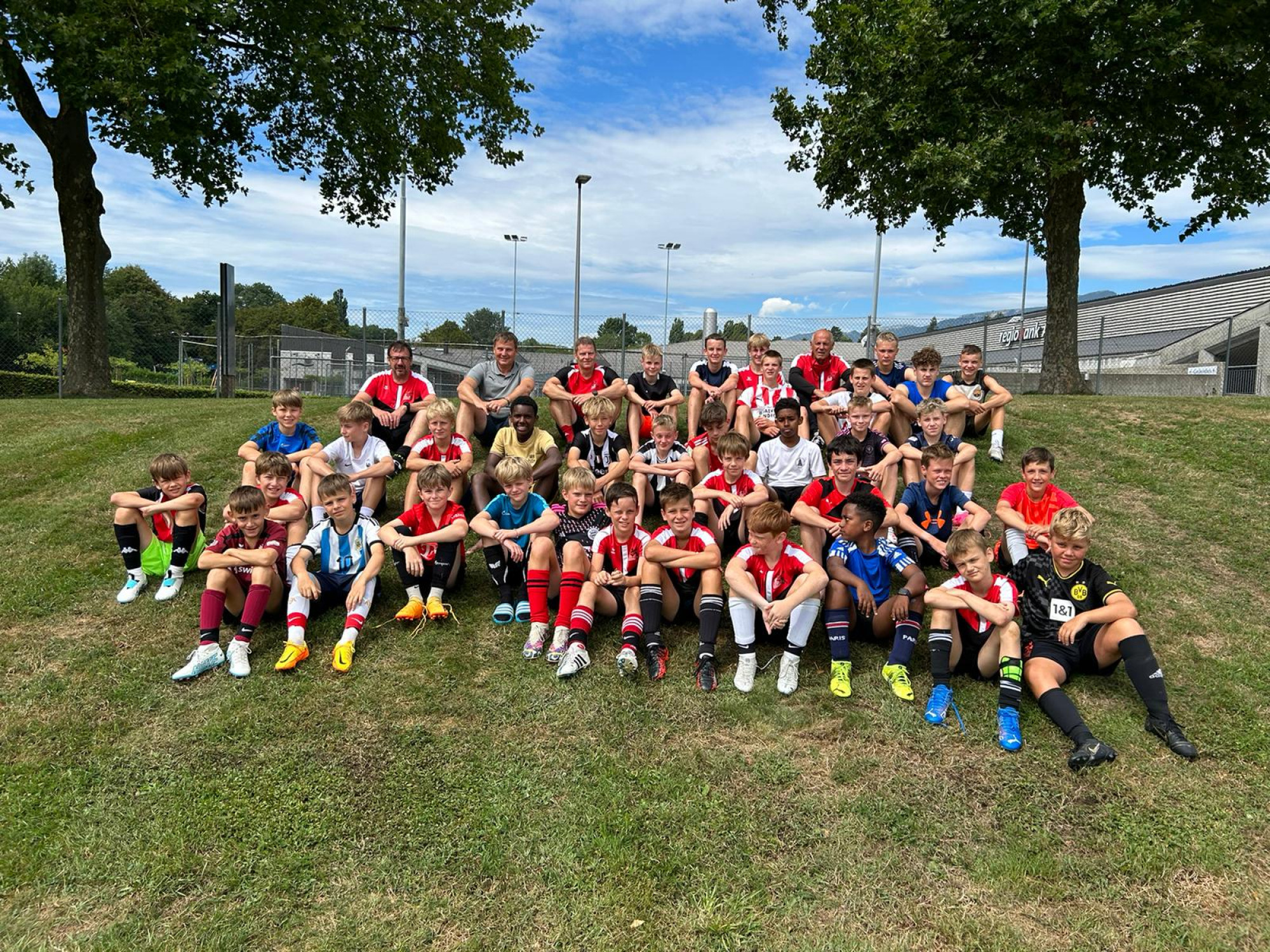Trotz der trüben Wetteraussichten für die Lagerwoche fanden sich am Montag, 24. Juli 36 bestens gelaunte Junioren und das Leiterteam beim Feuerwehrlokal in Schattorf ein. Bereits hier sah man eine grosse Disziplin und der Tross konnte bereits einige Minuten früher als geplant die Fahrt nach Zuchwil in Angriff nehmen. Kurz nach 09.00 Uhr bereits die Ankunft in Zuchwil. Nach einer kurzen Instruktion hiess es bereits antraben zum ersten Training. Hier zeigte sich zum ersten Mal, dass der Wettergott ein FCS Fan sein muss. Obwohl sich alle auf ein Regentraining einstellten, öffnete Petrus die Pforten erst nach Beendigung des Trainings. Dies wiederholte sich glücklicherweise die ganze Woche. Bis auf eine kurze Ausnahme schüttete es jeweils vor oder dann erst nach dem Training. Nach dem Mittagessen konnten dann die Jungs die neuen, umgebauten Schlafräume beziehen. Neben zwei Massenlager für die Jüngsten, durften sich die älteren in drei 8er Zimmer verteilen.